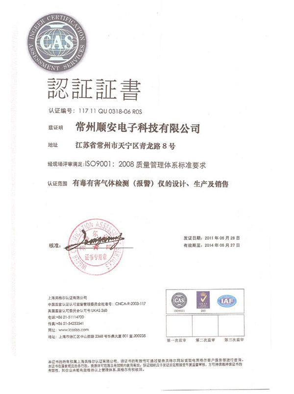 有毒有害其他检测(报警)仪的设计、生产及销售 ISO9001认证证书